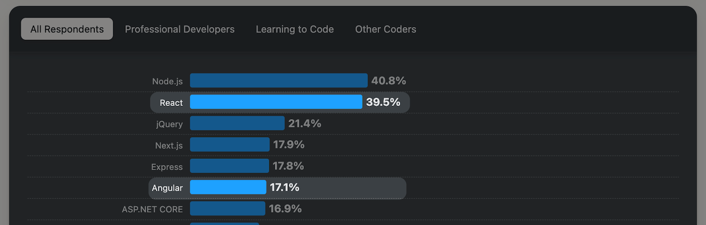 On peut rapidement voir que React est utilisé par 2.2x plus de développeurs dans le monde.