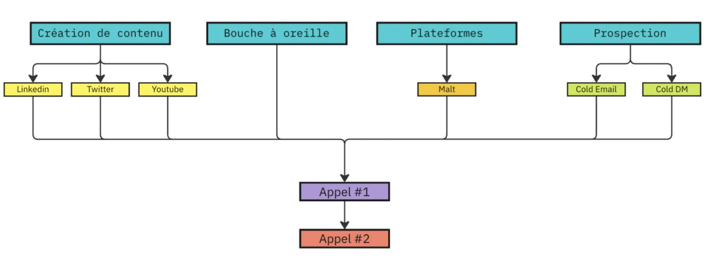 Une fois ton offre prête, il faut la présenter à des clients potentiels. Voici le schéma des différents canaux d'acquisition :