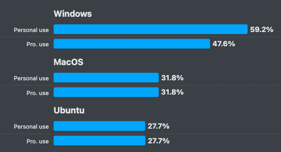On peut voir ici qu'une grande partie des développeurs, 59% utilise Windows pour un usage personnel.