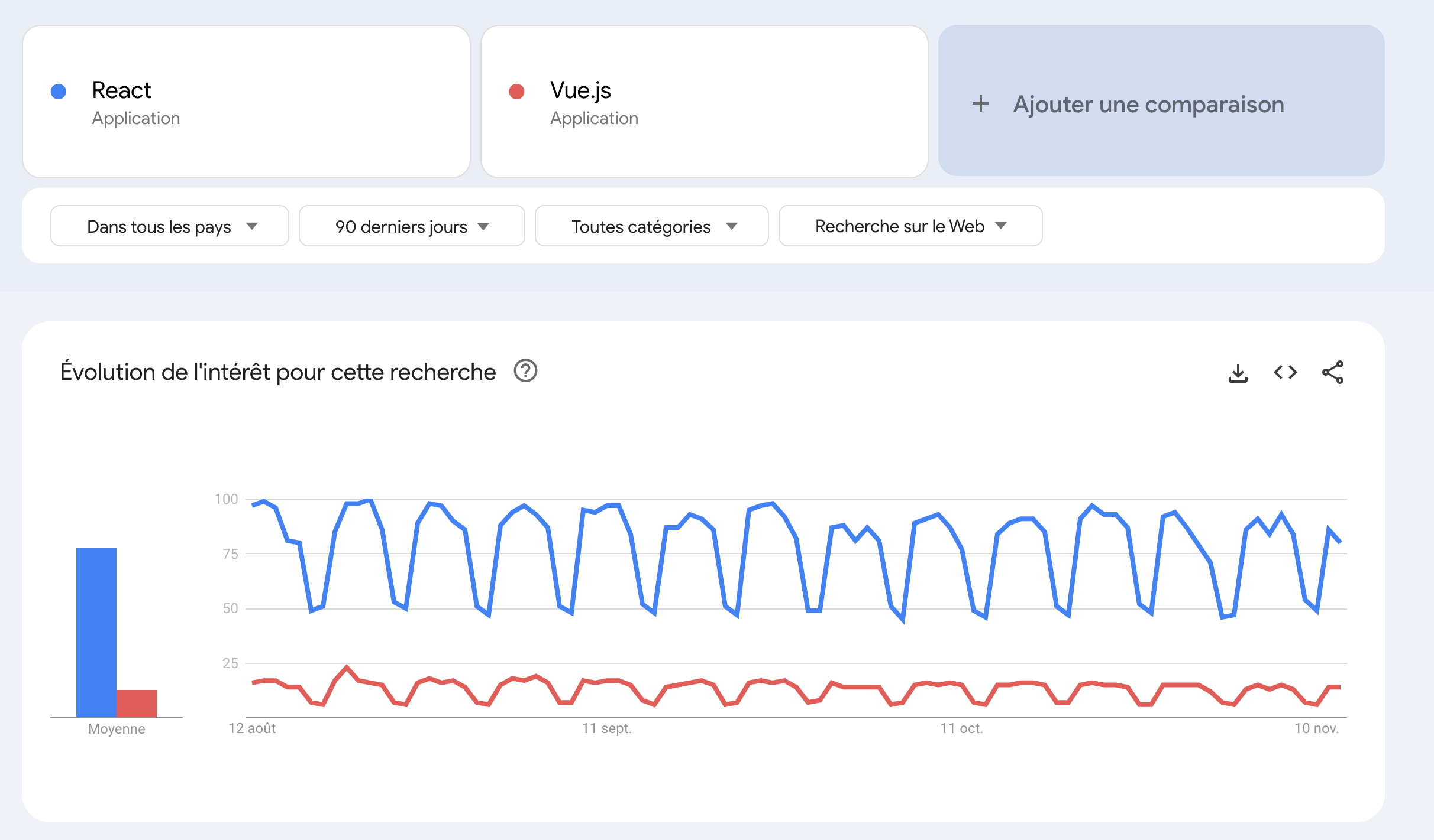Tu peux voir que la différence est énorme, presque 4.4x plus de questions sur React que VueJS. On peut dire que c'est car React aurait "plus de problèmes" mais non, il y a surtout une plus grosse demande. Suffit de regarder le nombre de recherches Google pour les deux mots-clés pour voir la même différence d'environ 4x :